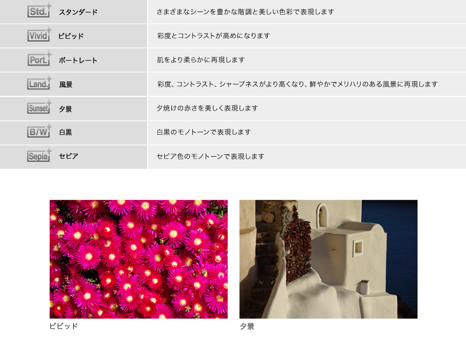 写真やカメラに詳しい知識がなくても、さまざまな写真表現を楽しめる「マイフォトスタイル」機能を搭載。液晶で被写体を確認しながら、「明るさ(露出補正)」「色合い(ホワイトバランス)」「鮮やかさ(彩度)」を手軽に調節できます。さらに、「ピクチャーエフェクト」の加工も液晶上で再現でき、液晶を見ながら、イメージ通りの写真に仕上げられます。