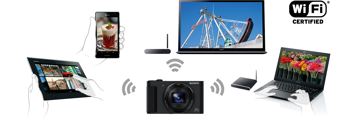 「Wi-Fi(R)対応ワイヤレス通信」機能搭載により、NFC非対応のスマートフォンやタブレットでも、撮ったその場でダイレクトに転送(*)したり、PCにワイヤレスで保存ができます。写真の共有、鑑賞、保存が快適に行えます。