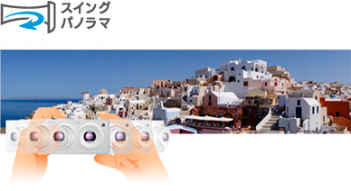画面に収まりきれない広大な風景や建造物を、シャッターボタンを押してカメラをひとふりするだけでパノラマ写真にできる「スイングパノラマ」機能を搭載しています。