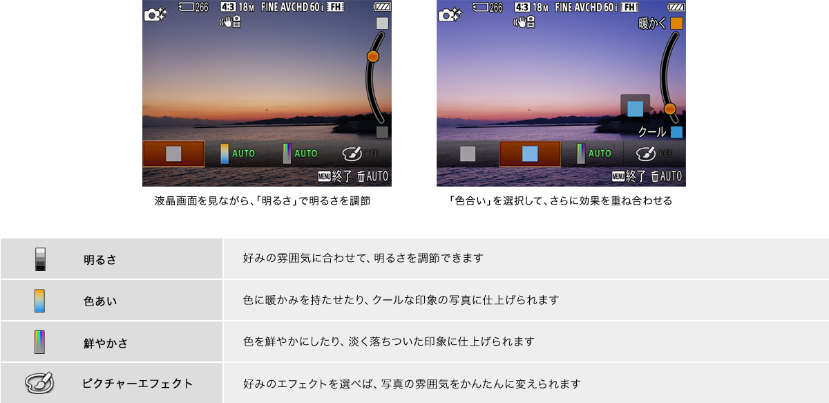 写真やカメラに詳しい知識がなくても、さまざまな写真表現を楽しめる「マイフォトスタイル」機能を搭載。液晶で被写体を確認しながら、「明るさ(露出補正)」「色合い(ホワイトバランス)」「鮮やかさ(彩度)」を手軽に調節できます。さらに、「ピクチャーエフェクト」の加工も液晶上で再現でき、液晶を見ながら、イメージ通りの写真に仕上げられます。