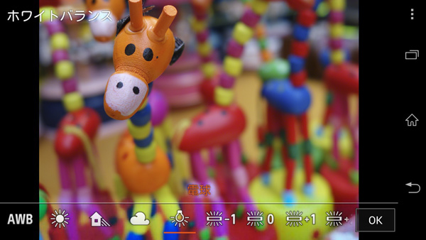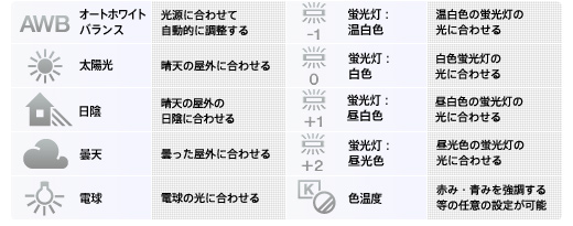 カメラがシーンの光源を自動で判定して、目で見たイメージに近い自然な色合いを再現する「オートホワイトバランス(AWB)」をはじめ、光源に合わせて選べる「太陽光」「電球」「蛍光灯」や、赤みや青みを強調できる「色温度」など、10種類のモードから選択できます。