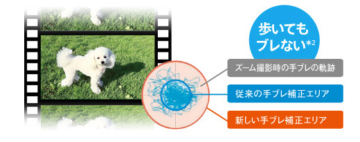 「光学式手ブレ補正(アクティブモード)」(*1)を搭載。これまでの光学式に加え、電子式の手ブレ補正を併用することにより、テレ端での補正性能がアップしました。歩きながらの撮影や、ズーム時の撮影でも、ブレを抑えて鮮明な映像を残せます。
