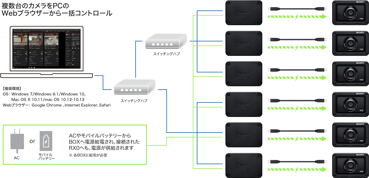 別売のカメラコントロールボックスCCB-WD1(*1)を使用すれば、複数台のカメラをパソコンのWebブラウザーから一括コントロールし(*2)、より安定した有線接続で低遅延のカメラ操作と高精度な同期を実現します。