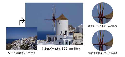 光学3.6倍ズームに加え、解像感を保ったままさらに約2倍のズームが可能な“全画素超解像”ズームを搭載。ソニー独自開発の“全画素超解像”技術により、一般的なデジタルズームのような画質劣化もなく、光学ズームと併用して、7.2倍相当(*)までズームアップ可能。高画質のまま、被写体に大きく迫れます。