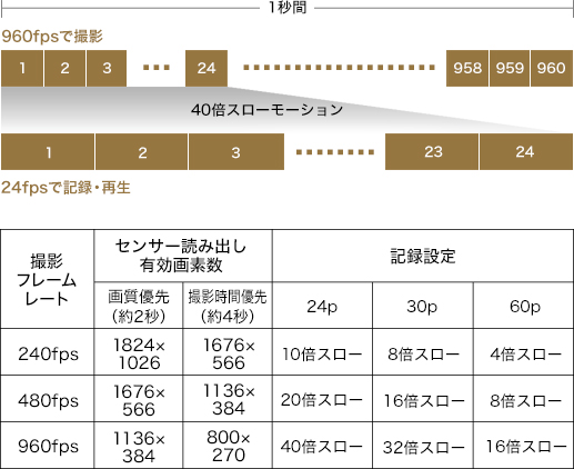 積層型CMOSセンサーにより、最大960fps(40倍)のスーパースローモーション撮影を実現。600mmまでの超望遠域までカバーすることでスポーツやレース競技など、離れた場所からしか撮影できないシチュエーションであっても被写体を大きく捉えたスーパースローモーションが撮影可能になります。撮影フレームレート(240fps、480fps、960fps)と記録設定(24p、30p、60p)をそれぞれ指定することで、4倍-40倍のスーパースローモーションが撮影できます。録画スタートのタイミングは「スタートトリガー(MOVIEボタンを押してから一定時間を記録)」と「エンドトリガー(MOVIEボタンを押すまでの一定の時間を記録)」の二種類から選択可能、予測のできない一瞬の動きなど、撮影チャンスを逃しません。画質設定は、画質優先(約2秒)・撮影時間優先(約4秒)の2種類から選択可能です。