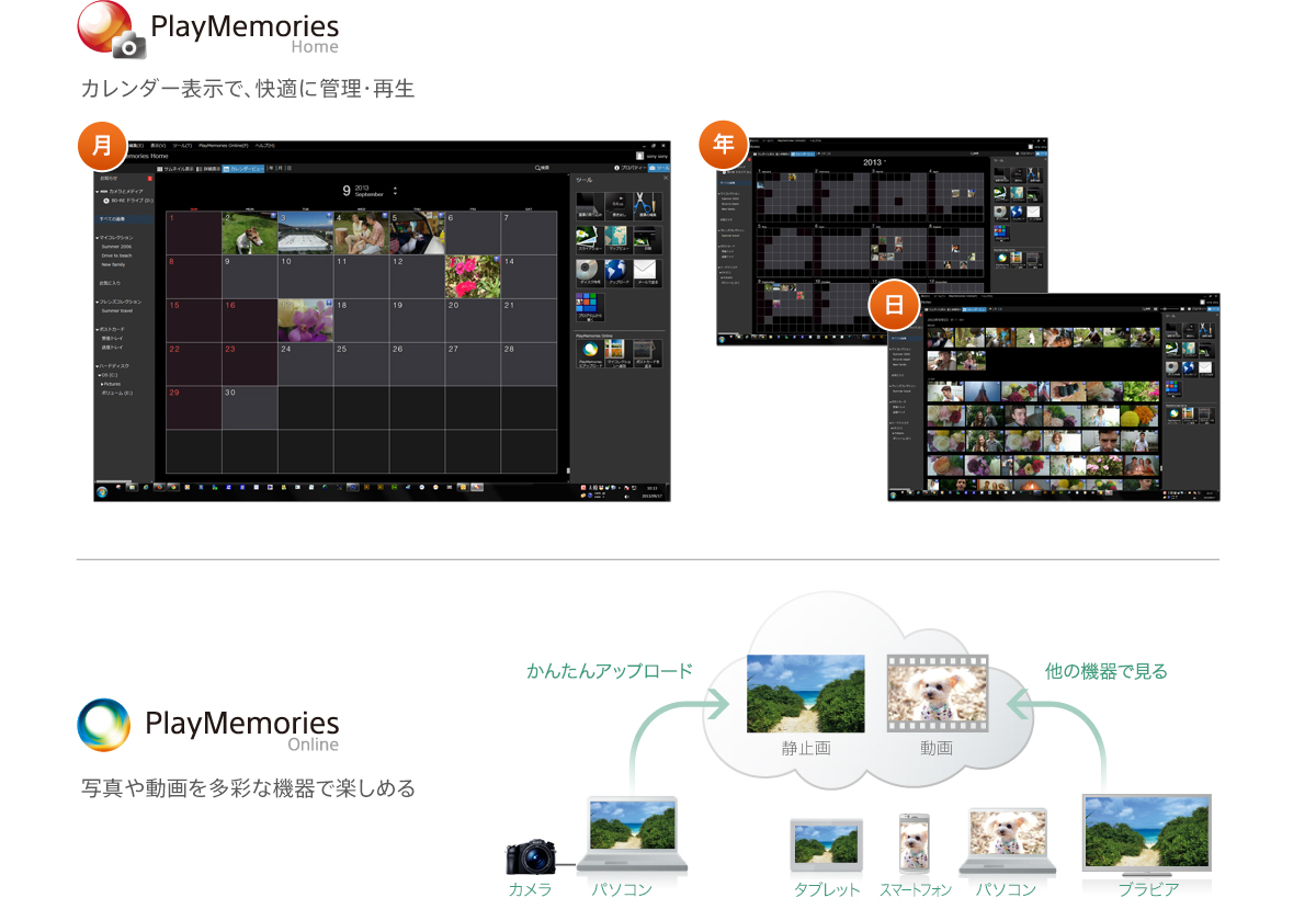 PCソフトウェアPlayMemories Homeを使えば、写真や動画をカレンダー表示でかんたんに整理・検索・再生。さらに、パソコンに取りこんだ写真の編集やDVD作成なども、便利な機能を使って手軽に楽しめます。クラウドサービスPlayMemories Onlineを利用すれば、アップロードした写真や動画をさまざまな機器で楽しむことが可能。オールシンク機能をオンにすれば、パソコンやスマートフォンそれぞれに保存している写真を自動的にクラウドへアップロード(*)してくれます。