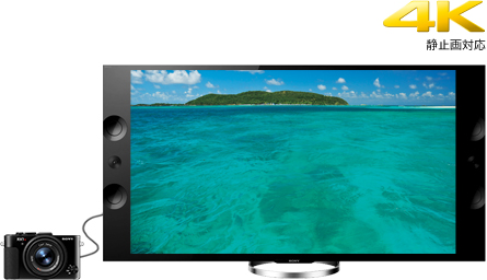 フルハイビジョン(1920×1080画素)の4倍、約829万画素の4K(水平3840×垂直2160画素)に対応したブラビアとHDMIまたはWi-Fi(R)(*)で接続すれば、高画質でとらえた美しい写真も解像感を損なうことなく大画面で鑑賞できます。ネットワーク対応テレビであれば、Wi-Fi(R)対応ワイヤレス通信機能を使って、カメラ内に保存されている写真を直接テレビに転送(Wi-Fi Direct)できます。