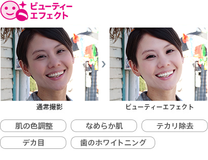 肌の色調整、なめらか肌、テカリ除去、デカ目、歯のホワイトニングの5種類のエフェクトで、ポートレートを魅力的にレタッチできます。各エフェクトの強弱は5段階で調節可能。2つのエフェクトを同時に使用することもできます。