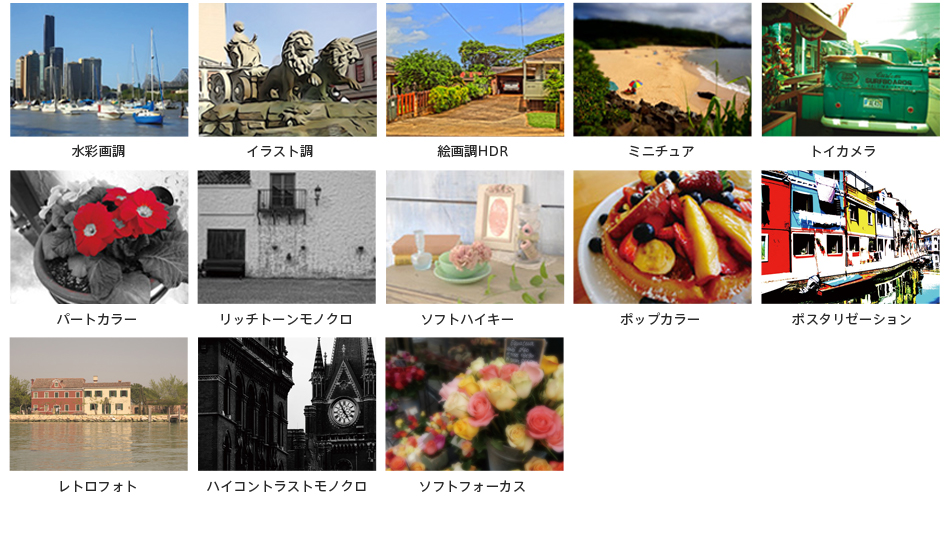 ユニークな作品づくりを楽しめる「ピクチャーエフェクト」機能を搭載。レトロな雰囲気で撮れる「レトロフォト」をはじめ、「リッチトーンモノクロ」「ソフトフォーカス」「水彩画調」など、全13種類のエフェクトを内蔵しています。パソコンで画像処理しなくても、カメラだけで印象的な作品をつくれます。また、「トイカメラ」「ポップカラー」「ポスタリゼーション」「レトロフォト」「ソフトハイキー」「パートカラー」「ハイコントラストモノクロ」は、動画撮影時にも使用できます。