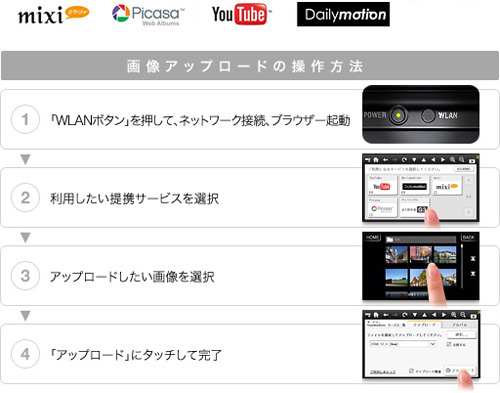 インターネット接続後、ソニーポータルサイトからmixi、Picasaウェブアルバム、YouTubeなどの提携サービスサイト(*)に一発アクセス。画像を選んでアップロードボタンを押すだけで、かんたんにアップロードできます。