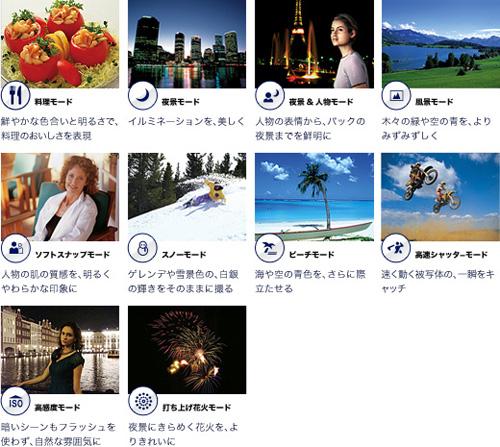 撮影シーンに応じたモードを選ぶだけで、カメラが適切なバランスに設定を調整するシーンセレクションに「料理モード」をプラス。グルメ雑誌のような、明るくおいしそうな写真が手軽に撮影できます。