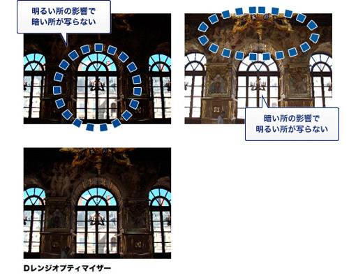 撮影シーンに合わせて露出と階調を自動補正>逆光時の黒つぶれを防ぐ、Dレンジオプティマイザー
