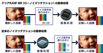 高感度撮影時に起こる、ノイズを低減するために「クリアRAW NR(ローノイズリダクション)」を搭載。画像処理前のデータ(RAWデータ)から直接ノイズをカットして、画像のざらつきをしっかりと抑えます。