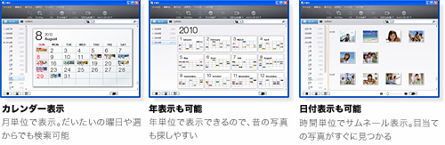 撮影した写真と動画の整理に便利な画像管理ソフト「PMB(Picture Motion Browser)」を付属。カメラとパソコンをつなぐだけで、撮影した写真と動画をすぐに取りこめます。取りこんだ写真と動画はカレンダー上に表示されるので、管理もかんたん。また、mixiやPicasaウェブアルバムなど、さまざまなネットワークサービス(*)への画像アップロードも手軽にできます。「スイングパノラマ機能」で撮影したパノラマ写真を、フルスクリーンでスクロール再生することもでき、パソコン上で臨場感あふれるパノラマ写真を鑑賞できます。