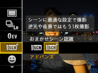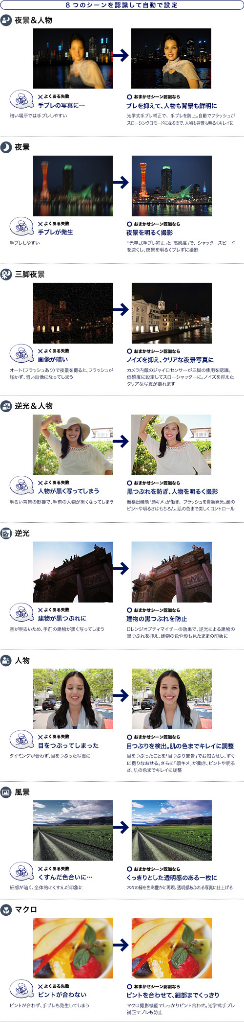 暗い場所や逆光など失敗しやすいシーンを認識し、最適な設定でキレイに撮れる「おまかせシーン認識」を搭載。「夜景」「逆光」「人物」などの8つのシーンで、ひときわ美しい写真を撮影できます。また、画面表示も分かりやすく、認識しているシーンや設定状況を一目で確認できます。