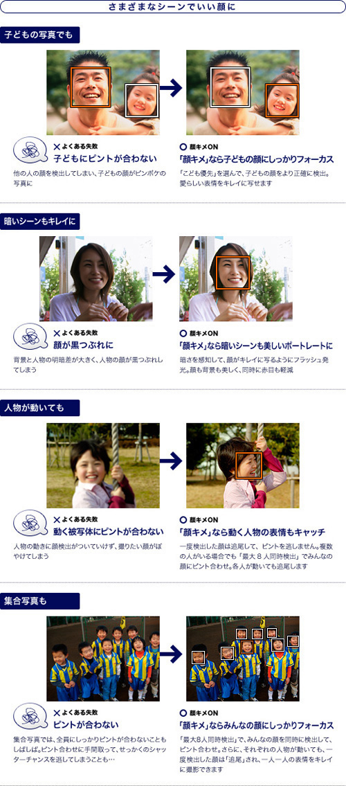 「かんたん撮影モード」を選べば、設定するのは「画像サイズ」「フラッシュ」「セルフタイマー」だけになり、よりわかりやすく操作できます。設定はシンプルでも、同時に「おまかせシーン認識」や顔検出機能「顔キメ」などがしっかりと働いているので、シーンに合った最適な設定でキレイに撮影できます。また、メニュー画面も、やさしい言葉で大きく表示されます。
