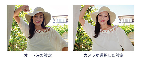 夜景や逆光など失敗しやすいシーンでは、オート時の設定に加えて、別の設定でもう1枚撮影。あとから好きな一枚を選べます。「人物」認識時には「目つぶり軽減」で2枚撮影して、目をつぶっていない1枚だけを記録します(*)。