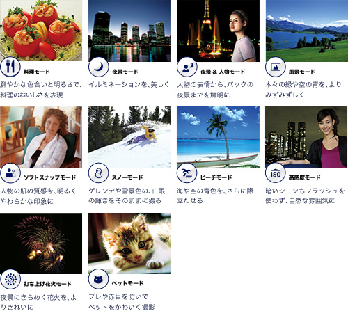 シーンに応じてモードを選ぶだけで、適切な設定で撮影できる「シーンセレクション」にペットモードをプラス。動きまわるペットのブレを防ぐほか、ペットをかわいく写すこだわりの設定に自動制御されます。