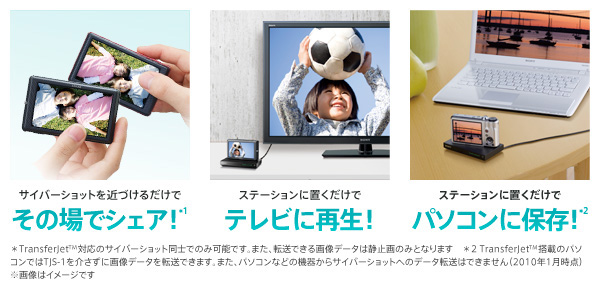 次世代の無線転送技術 TransferJet(TM)に対応。別売のTransferJet(TM)搭載“メモリースティック”やステーションを使えば、パソコンやテレビにケーブルを接続することなく写真転送が可能です。たとえば、パソコンに写真を保存したい場合は、パソコンにつないだステーションにカメラを置くだけで写真が転送され、すぐに保存できます。これを一例に、写真の共有(Share)、テレビでの再生(View)、写真の保存(Store)が、かつてない手軽さで行えます。