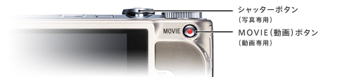 動画撮影のスタート/ストップは、このMOVIE(動画)ボタンを押すだけ。従来のようにメニュー設定の面倒がなく、モードの切り替えなしに撮影を開始できます。