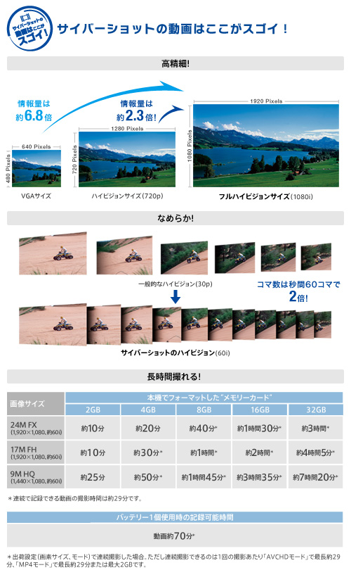 “ハンディカム”や地デジ放送と同じクオリティーの、フルハイビジョン(1920×1080/60i)画質を実現。さらに、高圧縮率のAVCHD方式を採用することで、フレームレート(コマ数)とビットレート(容量)が大幅に向上し、よりなめらかで高画質な映像を長時間撮影できます。