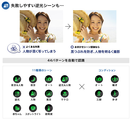 シーンに合わせて設定を自動調整してくれる「おまかせシーン認識」が動画撮影にも対応。動画撮影では合計44パターンの組み合わせから、撮影シーンに合わせて設定を細かく自動調整。逆光やスポットライトなど難しいシーンでも美しい映像を残せます。