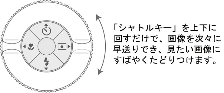 新しく搭載した「シャトルキー」を使えば、たくさんの画像の中から、見たい画像をすぐに探せます。回すだけで、画像をらくらくスクロールでき、親指ひとつで目当ての画像にたどりつけます。