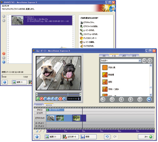 動画編集/DVD作成ソフト「NeroVision Express(ネロビジョン エクスプレス)3」を付属。「MPEG4」ムービーをパソコンで簡単に編集できます。また、タイトルやエフェクトを加えて、自分だけの作品づくりを楽しんだり、編集後はDVDにして、プレゼントしたりできます。