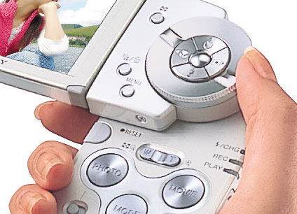 軽く押すだけで、液晶部分がスライドして電源ON。操作しやすい大きなボタンで、撮影も再生もワンプッシュ。難しい操作は必要なく、片手でも操れるから、撮りたいときにサッと構えてすぐ撮影できます。