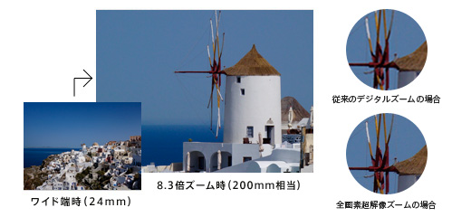 DSC-RX10では、8.3倍の光学ズーム撮影に加え、全画素超解像ズームも動画撮影に対応。全画素超解像ズームを使用すれば、最大16.6倍まで解像感を保ったまま被写体を拡大できるので、撮影表現の幅が広がります。