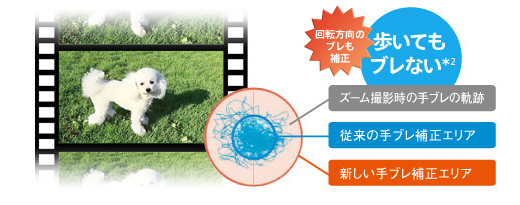 動画撮影時のブレを抑える「光学式手ブレ補正(アクティブモード)」(*1)を搭載。これまでの光学式に加え、電子式の手ブレ補正を併用することにより、テレ端での補正性能がアップしました。さらに、タテ・ヨコだけでなく回転方向のブレ補正も可能となり、さらにブレを抑えた映像を撮影できます。
