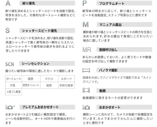シャッタースピードと絞り値を自動設定する「プログラムオート(P)」をはじめ、「絞り優先(A)」「シャッタースピード優先(S)」「マニュアル露出(M)」など、自分の意図を反映して本格的な撮影を楽しめるマニュアルモードを搭載。さらに、クリエイティブな表現が楽しめる撮影モードや「プレミアムおまかせオート」などのオート撮影機能も充実しています。