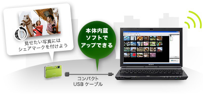 カメラ内蔵PCソフトウェア「PMB ポータブル」で、写真をパソコンに取りこむことなくアップロードできます。外出先のパソコンからもアップロード可能。あらかじめアップロードする写真にシェアマークをつけておけば、すばやくアップロードできます。