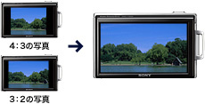 写真を鑑賞するときは、アイコンを隠し、フル画面表示にすることもできます。「ワイドズーム表示」を使えば、4:3や3:2の画角で撮影した写真も、16:9の画角で3.5型ワイド画面いっぱいに表示できます。