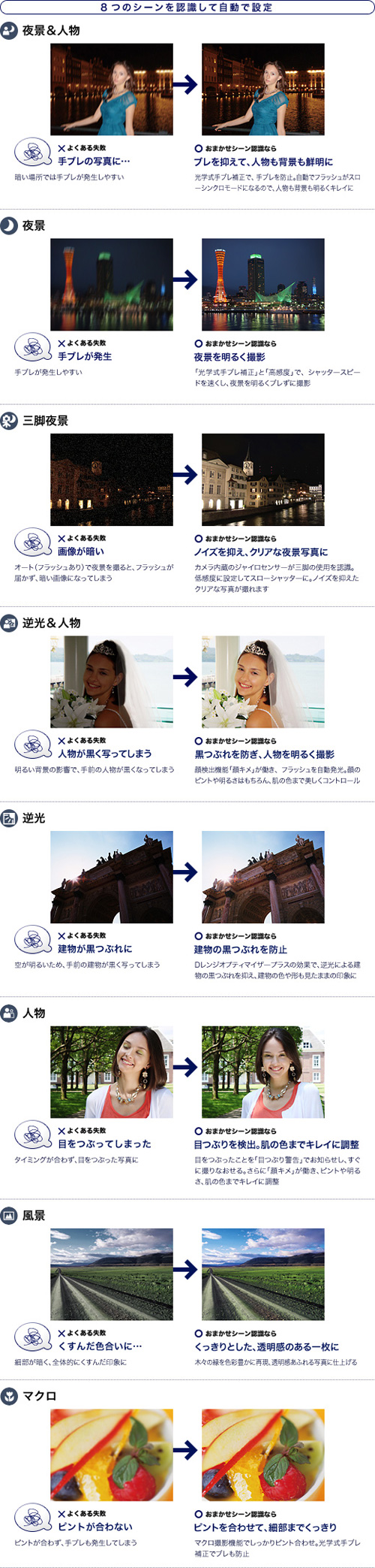 夜景や逆光など失敗しやすいシーンを認識し、最適な設定でキレイに撮れる「おまかせシーン認識」が進化。認識できるシーンに、「人物」「風景」「マクロ」が追加され、合計8シーンで美しく撮影できます。また、「夜景&人物」認識時には自動的にスローシンクロ撮影になり、人物と背景の両方をいちだんと明るくキレイに撮影できます。
