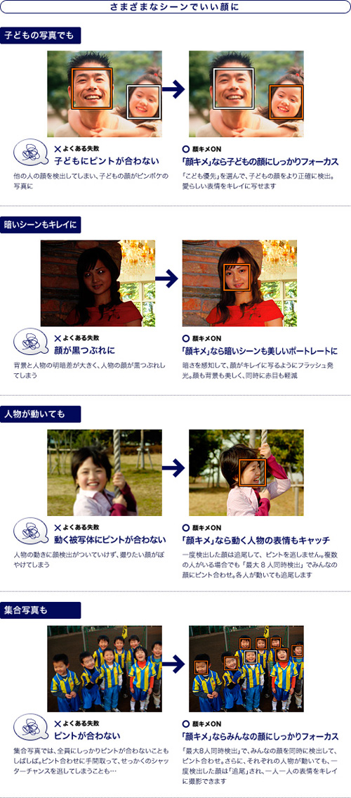 独自開発の顔検出エンジンと、先進の画像処理エンジン「BIONZ(ビオンズ)」との組み合わせにより、顔検出機能「顔キメ」を実現。高速かつ高精度に、肌の色までキレイに調整します。