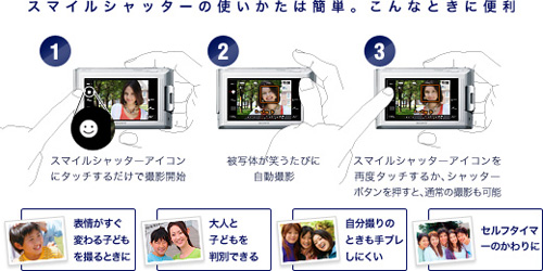 人が笑顔になるたびに、自動でシャッターが切れる「スマイルシャッター」が大幅に使いやすくなりました。スマイルシャッターアイコンをタッチするだけで、すぐに笑顔を撮影開始。さらに、従来の連続撮影時の枚数制限(6枚)がなくなり、光学ズームも使用可能となりました。また、被写体が笑っていない時は、シャッターを押せば、簡単に通常の撮影に戻れます。もちろん、大人・子どもの自動判別(*)もできるので、狙った笑顔の撮り逃がしを防ぎ、子どもの自然な笑顔をたくさん残せます。