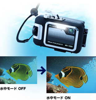 ウォータープルーフケースを使用した水中撮影時に便利な「水中モード」。水中の光に適したホワイトバランス調整や色補正を行います。自動で適した色合いに調整する水中ホワイトバランス「オート」に加え、青色の強い水中に適した「水中1」、緑色の強い水中に適した「水中2」、水中でのフラッシュ撮影に便利な「フラッシュ」の4モードから、撮影シーンに合わせてモードが選べます。