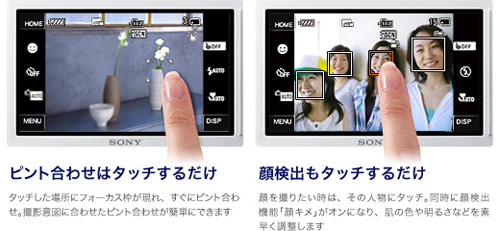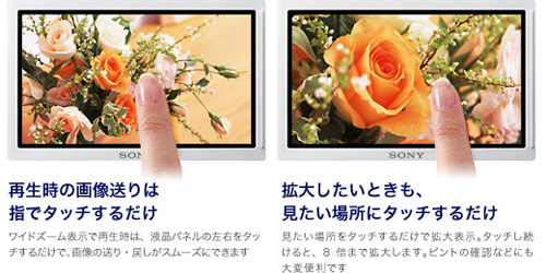 アイコンにタッチしながら、目当ての機能にスムーズにたどりつける「タッチパネル液晶」。撮影時は、タッチするだけでピント合わせが可能。もちろん、再生時の操作も、タッチパネルで簡単です。さらに、タッチアイコンは大きく表示されるので押しやすく、爪の長い方でも快適に使えます。