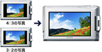 3.0型ワイド液晶を搭載。撮影時は被写体を大きく映しだし、構図やピントの確認もラクラク。再生時には、ワイド画面に写真を表示して、みんなに見せて楽しめます。さらに、ワイドズーム表示をつかえば、画像サイズにかかわらず、3.0型ワイド画面いっぱいに写真を表示。視野に近い気持ち良さを実感しながら、写真を鑑賞できます。