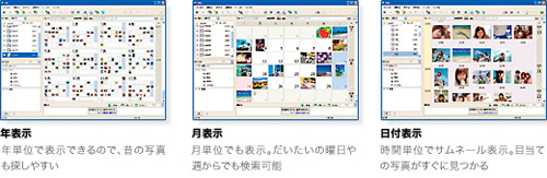 取りこんだ写真の中から、顔の写真を検索できます。さらに、検索した顔の画像から1枚選んで、似た顔の画像を絞り込むことも可能。過去に撮った写真や他社のデジタルスチルカメラで撮った写真にも対応します。