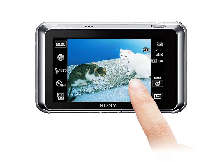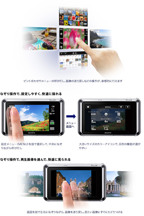 タッチパネル操作の「3.0型ワイド・クリアフォト液晶プラス」を搭載。「タッチAF」で、液晶上の被写体にタッチするだけでピント合わせ。また「なぞり操作」にも対応しており、設定メニューの呼びだしや再生画像の送り戻しなどを指でなぞりながら直感的に操作できます。さらに、表示メニューのカスタマイズもでき、よく使う機能をあらかじめ画面に表示しておくこともできます。