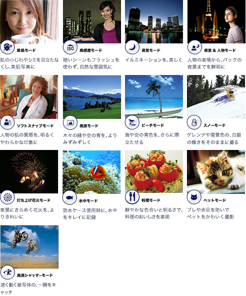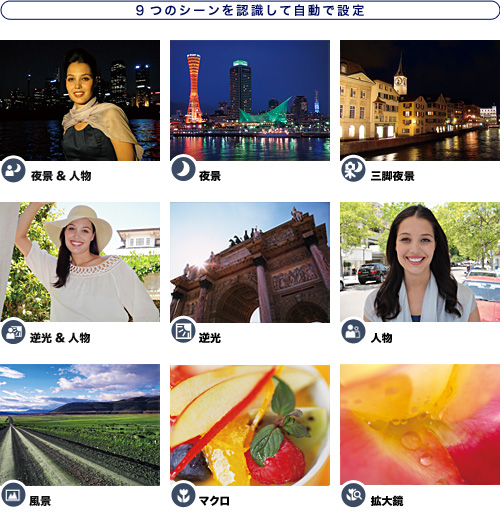 暗い場所や逆光など失敗しやすいシーンを認識し、最適な設定でキレイに撮れる「おまかせシーン認識」を搭載。「夜景」「逆光」「人物」などの9つのシーンで、ひときわ美しい写真を撮影できます。また、画面表示も分かりやすく、認識しているシーンや設定状況を一目で確認できます。