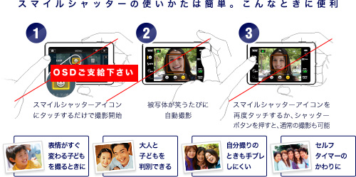 人が笑顔になるたびに、自動でシャッターが切れる「スマイルシャッター」が使いやすく進化。メニュー画面のスマイルシャッターアイコンをタッチすれば、すぐに「スマイルシャッター」を起動できます。さらに、光学ズームも使用でき、通常の撮影に戻りたいときはシャッターボタンを押すだけ。また、大人・子どもの自動判別(*)もできるので、狙った笑顔の撮り逃しを防ぎ、子どもの自然な笑顔をたくさん残せます。