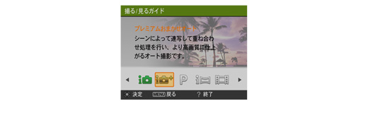 操作がわからないときや、撮影モードの使い方でアドバイスがほしいときに役立つ「カメラ内ガイド」を搭載。各機能の使い方や、その撮影方法まで解説してくれるので、外出先で操作がわかりづらい時でも、その場で解決できます。