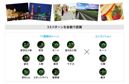 「おまかせオート撮影モード」は11種類のシーン認識に加え、被写体や撮影者の状況(コンディション)も認識。合計33パターンの組み合わせから、撮影シーンや被写体に合った最適な設定にきめ細かく自動調整します。