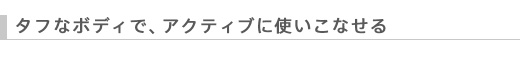 ボディ周囲にあしらったエラストマー素材のバンパーのタフ感と、フロント面のスタイリッシュ感が調和する独自のデザインを実現。ボディ前面には、キズがつきにくいようアルミ材を使用するとともに、グリップを配置。アクティブなシーンでのホールド感を追求しています。