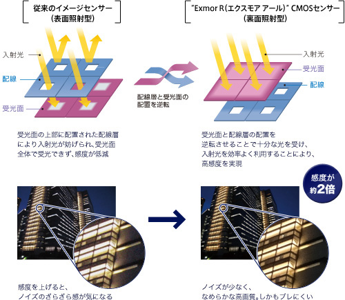 ソニー独自開発の有効1020万画素、1/2.4型CMOSセンサー“Exmor R(エクスモア アール)”を搭載。CMOSセンサーへの入射光を効率よく利用できる「裏面照射技術」を採用することで、感度が約2倍(*2)アップし、ノイズを約1/2に低減します。これにより、夜景や室内などの暗いシーンでも、ノイズが少なく、なめらかで美しい写真を撮影できます。