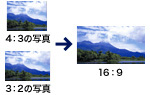 4:3、3:2で撮影した画像も、画面の左右に黒い帯がでないようにテレビの画面16:9に合わせて表示できます。