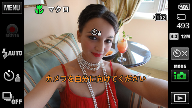 従来のセルフタイマー機能に「自分撮りタイマー」を搭載。自分の顔にレンズを向けてフレーム内に入るように動かすと、カメラが撮影者の顔を検出して自動でシャッターを切ります。顔検出機能によって最適な構図を決めるので、フレームから外れることなく“自分撮り”が行えます。また、設定には「自分撮り1人」「自分撮り2人」のいずれかを選択できます。